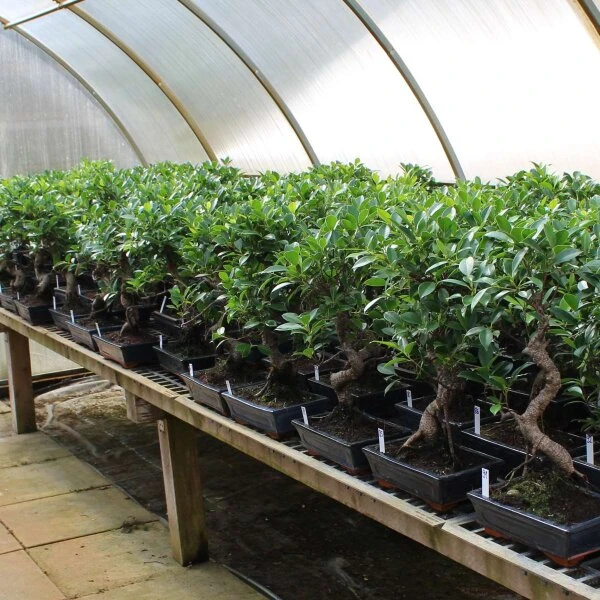 Auffällig bei diesen Feigenbonsai sind die vielen Luftwurzeln, die die Pflanzen bei hoher Luftfeuchte bilden. Die Luftfeuchte kann man durch Besprühen erhöhen.