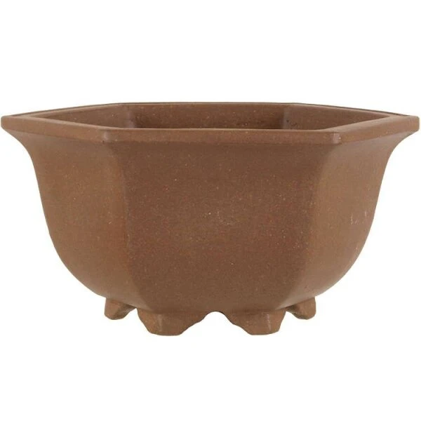 Bonsaischale (Unglasiert, Braun, Sechseckig) in den Abmessungen: 14cm Länge, 12.5cm Breite, 6.8cm Höhe.