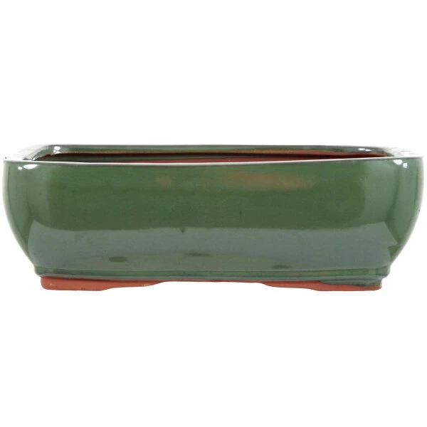 Bonsaischale (glasiert, grün, rechteckig) in den Abmessungen: 25.5cm Länge, 20cm Breite, 8cm Höhe. Gute Standardqualität aus der Töpferstadt Yixing.
