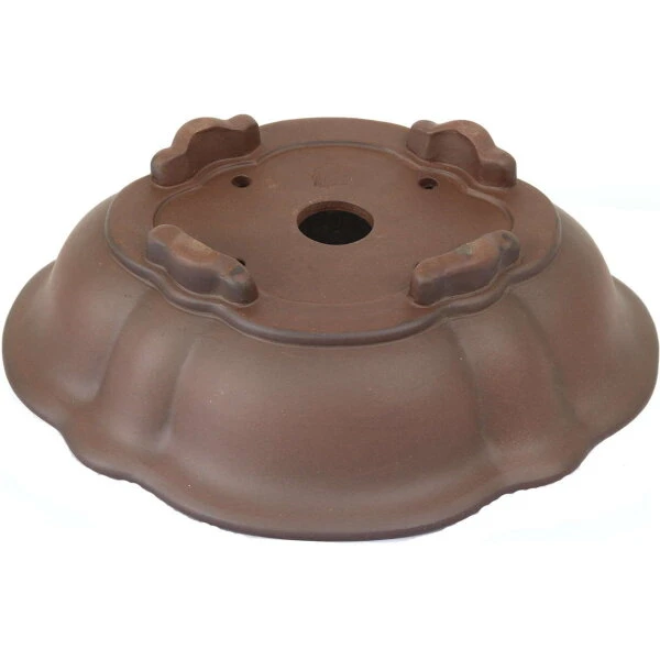 Bonsaischale (unglasiert, antik-braun, lotusförmig), handgemacht, in den Abmessungen: 26cm Länge, 23cm Breite, 8cm Höhe.