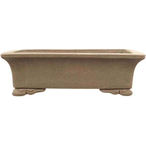 Bonsaischale (unglasiert, grau, rechteckig), handgemacht, in den Abmessungen: 30cm Länge, 21.5cm Breite, 9cm Höhe.