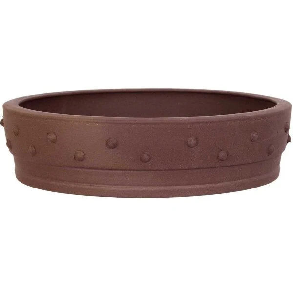 Bonsaischale (unglasiert, braun, rund), handgemacht, in den Abmessungen: 30cm Länge, 30cm Breite, 7.5cm Höhe.