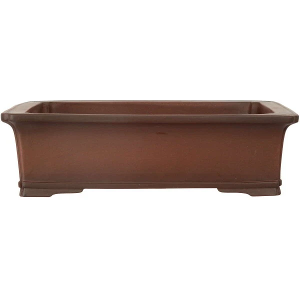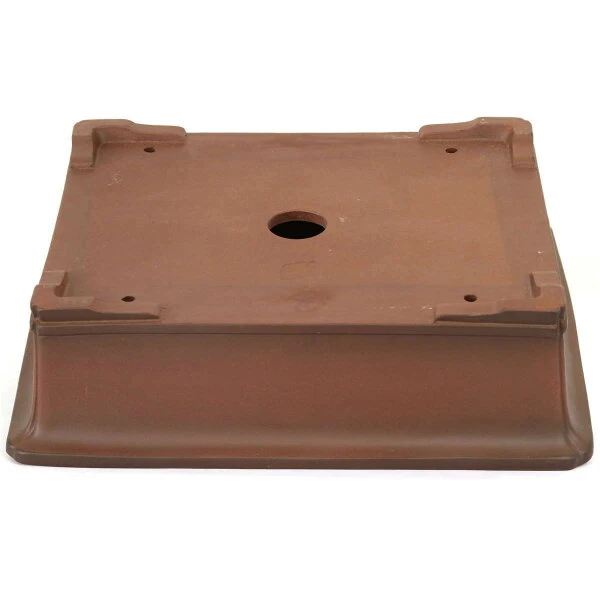 Bonsaischale (unglasiert, antik-braun, rechteckig), handgemacht, in den Abmessungen: 34.5cm Länge, 29cm Breite, 10cm Höhe.