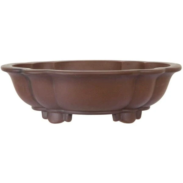 Bonsaischale (unglasiert, antik-braun, lotusförmig), handgemacht, in den Abmessungen: 38cm Länge, 33cm Breite, 11cm Höhe.