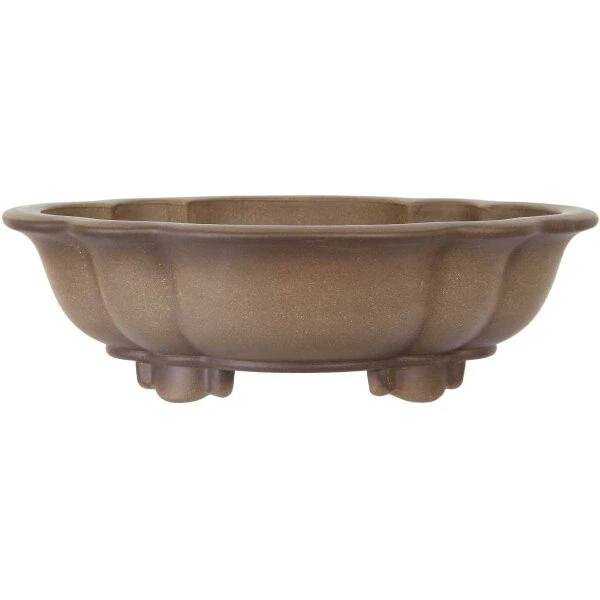 Bonsaischale (unglasiert, antik-grau, lotusförmig), handgemacht, in den Abmessungen: 39.5cm Länge, 34.5cm Breite, 11cm Höhe.