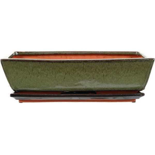 Bonsaischale mit Untersetzer (glasiert, grün, rechteckig) in den Abmessungen: 33.5cm Länge, 20.5cm Breite, 8.5cm Höhe. Gute Standardqualität aus der Töpferstadt Yixing.